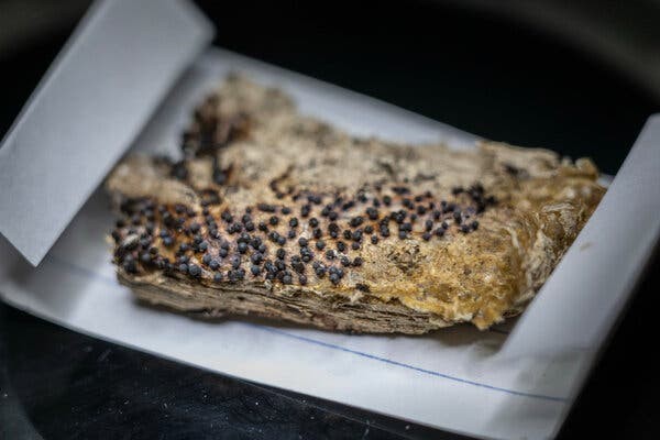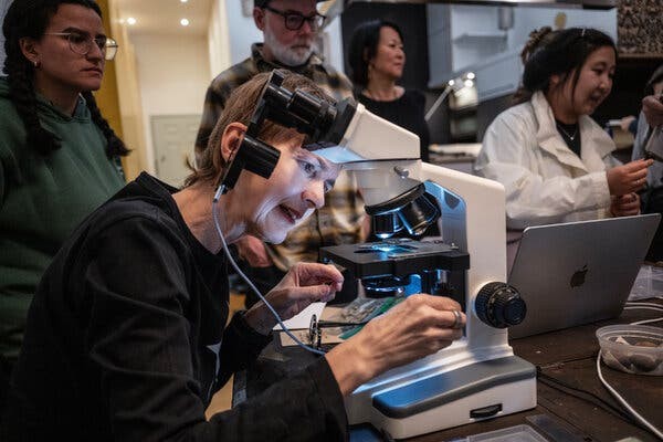 Several society members have developed specialties. There is a lichenologist and a slime mold enthusiast. Ms. Jakob, a marketing strategist by day, is the resident expert in life that sprouts from animal feces, lovingly chronicled on her Instagram account @dung_fungi. She collects droppings from herbivores (relatively odorless, unlike carnivore poop), puts them in restaurant takeout containers, waters them daily and sees what grows. “Once you grab a bunch of dung and bring it home, it’s a never-ending show,” she said. One winter’s day in 2023, on a cricket pitch in Van Cortlandt Park in the Bronx, she gathered some dung from a Canada goose. About three weeks later, Ms. Jakob recalled, “There was something growing on it that did not look like anything in the literature.” There were small growths “like Easter eggs” underneath a blanket of black fibers, she said. Ms. Jakob sent samples to a mycologist, who agreed that she had discovered a new species and helped her publish a paper describing it. Mr. Crenson, a graphic designer, had a similar experience. In 2021, at Green-Wood Cemetery in Brooklyn, he discovered a fungus that “looked a bit like chocolate chips sticking up out of a cookie,” he said. A mycologist later named it after him: Nemania ethancrensonii. Sigrid Jakob, a former club president, is a self-taught expert in fungi that grow on dung. The society has collected 237 types of fungus that it has not been able to identify, many dozens of which are most likely new species, Ms. Jakob said. There are an estimated five million species of fungus on the planet and only about 150,000 have been named. The mother of the toddler who found the crust fungus, Sarah Almodovar, is like most of the society’s 800 members: simply an urban nature lover glad for an excuse to walk in the woods. “It’s been so good for our family because it’s given us so many things to learn about,” she said. A little farther along on the walk, past some bioluminescent mushrooms (visible in a dark bathroom after about 15 minutes, Mr. Crenson promised), a society member named Andrew Cannon proffered a handful of brown grass streaked with black powder. “Check out this gorgeous rust!” he said. Rusts are fungi that primarily feed on live plants rather than on decaying dead ones. Many of them are harmful to agriculture. Mr. Cannon came to love them because they have up to five visually distinct spore cycles, and because many require two completely different hosts, like a grass and a tree, to reproduce. They have been found miles up in the atmosphere and are known to cross the Atlantic Ocean. Even in colder months, when the things that most people think of as mushrooms are not around, fungi are busy decaying dead wood. “I have a rust growing on this grass right outside my apartment in Manhattan that I can watch the spores slowly turn into the next one,” Mr. Cannon said. Even the least impressive-looking finds were cause for celebration. Wilton Rao, the club’s lichen specialist, pointed out an olive-drab blotch on a tree trunk: common greenshield lichen. Like many lichens, it is highly sensitive to pollution. Decades ago, Mr. Rao said, it was not found in New York. Now, he said, it’s “absolutely everywhere.” The day’s showstopper was a dense constellation of black blobs that looked like papaya seeds, or caviar on a cracker. Everyone got out their hand lenses, which the society distributes on every walk. Magnified, each bead of caviar revealed itself to be an iridescent, pockmarked sphere, with sparkles of purple and blue, growing at the end of a skinny stalk. People oohed and aahed. Mr. Crenson took a chunk home to Brooklyn, where he identified it as a slime mold, Lamproderma nigrescens, previously documented on iNaturalist in this country only in California and Oregon. He brought the specimen to a club show-and-tell at Ms. Jakob’s apartment the following week. People clustered around the four microscopes set up on the dining room table. Elan Trybuch was annoyed because he had missed the Inwood Hill walk. “They found my white whale!” he said. The black beads of the slime mold Lamproderma nigrescens are revealed to be iridescent, pockmarked spheres when examined under a microscope.