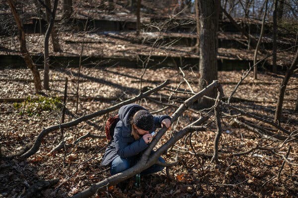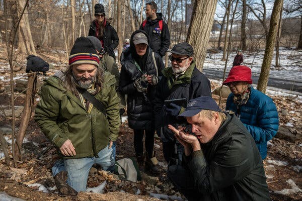 New York City can be a place of almost incomprehensible abundance. Its eight million residents speak 700 languages. It has 29,000 restaurants and bars. The city’s dizzying profusion extends to the natural realm: 2,143 species of mushrooms and related life-forms have been documented on the popular citizen-science app iNaturalist — more than in any other major city on earth. This is perhaps less a testament to the city’s considerable biodiversity than to the inexhaustible enthusiasm of the New York Mycological Society. Most of the things people think of as mushrooms do not start showing up until June. But the society’s band of dedicated amateurs leads mushroom expeditions almost every weekend year-round. On a recent walk in Inwood Hill Park in Upper Manhattan, when the grass was still brown and the trees were bare, the ground underfoot teemed with life. A toddler picked up a stick scabbed with tawny scales. “He found something,” his mother said as she handed the stick to Ethan Crenson. “Neato!” exclaimed Mr. Crenson, the society’s president. “That’s a basidiomycete crust!” Mr. Crenson flipped the stick over and pointed out a row of gnarled gray-black objects that looked like diseased toenails and identified them as hairy oysterling, “the first gilled mushrooms of the day.” Ethan Crenson, left, and Andrew Cannon, crouching at right, of the New York Mycological Society admired a rare slime mold on a mushroom walk in Upper Manhattan a few weeks ago.